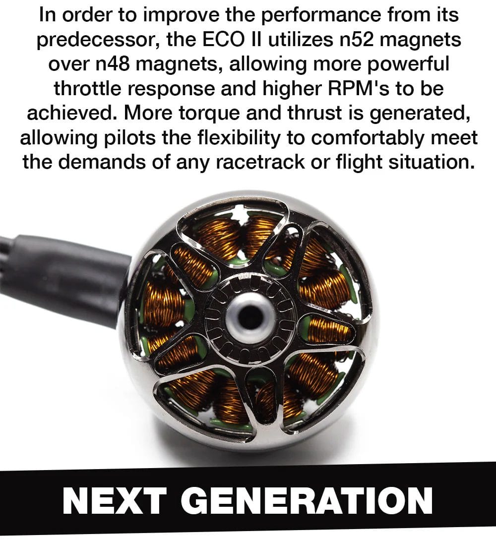 In order to improve the performance from its predecessor, the ECO II utilizes N52SH arc magnets over prior N48 magnets, allowing more powerful throttle response and higher RPMs to be achieved. More torque and thrust is generated, allowing pilots the flexibility to comfortably meet the demands of any racetrack or flight situation.