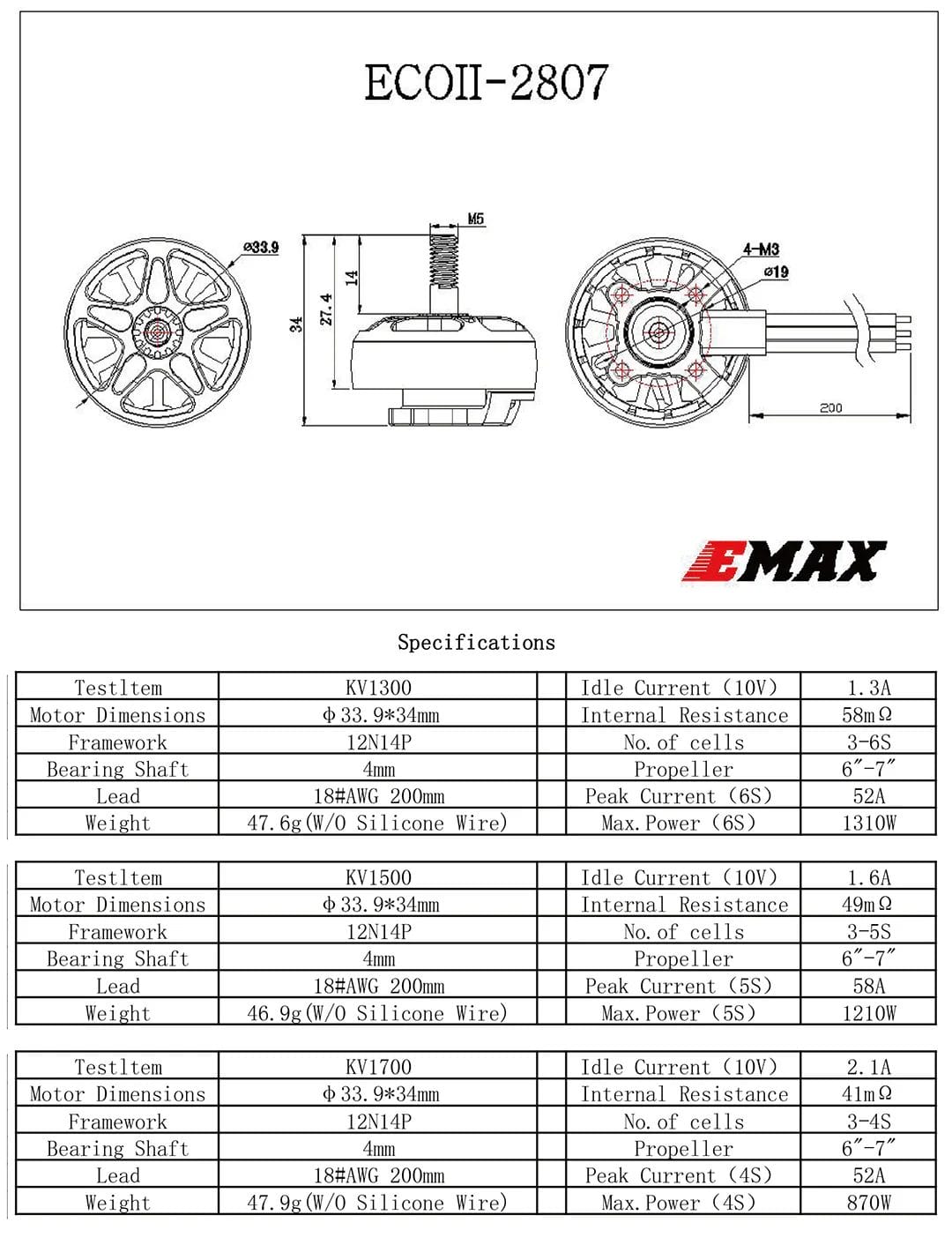 Emax ECO II Series 2807 3-6S 1300KV Motor