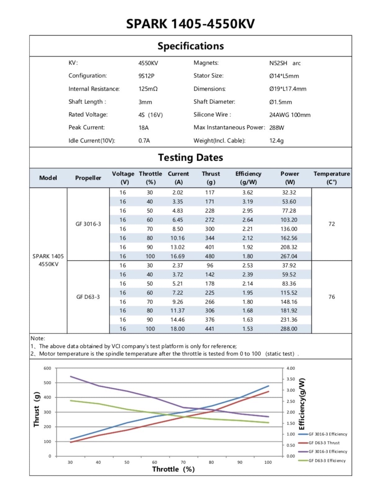The VCI Spark Motor 1405 4550KV, with a 1.5mm shaft diameter, is a compact and powerful brushless motor. It boasts a high KV rating of 4550KV, utilizing N52SH arc magnets and a 9512P configuration. With dimensions of Ø19*17.4mm and a lightweight of 12.4g, this motor is designed for efficiency and performance. It operates at a rated voltage of 4S (16V), can handle a peak current of 18A, and offers a maximum power of 288W.